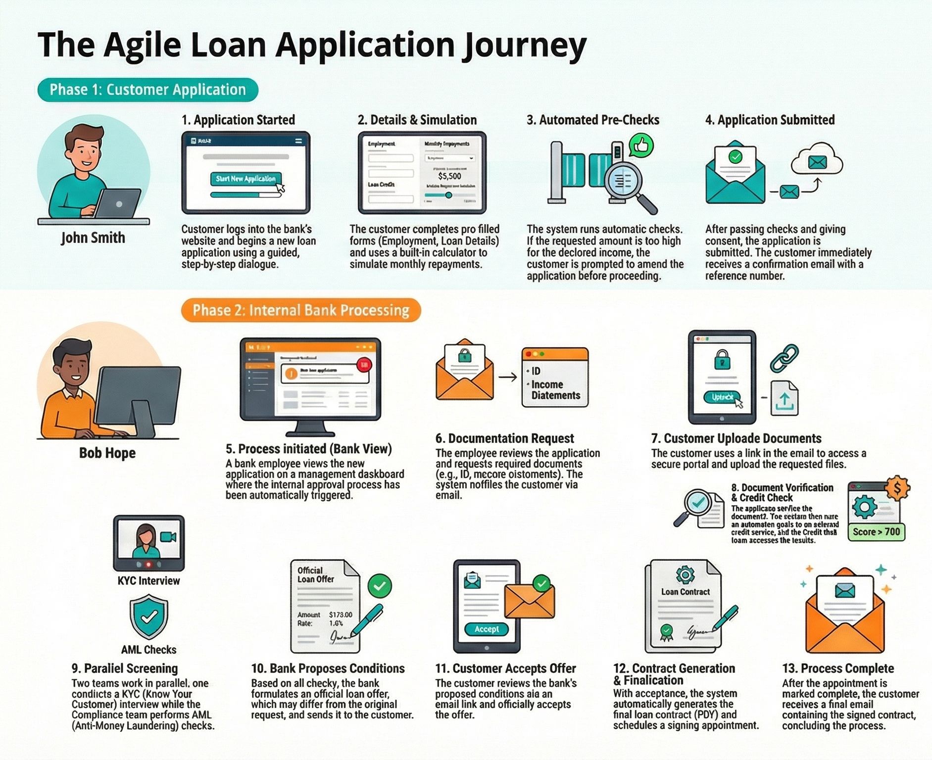 I wanted to pick an example process that was not too simplified (like something that the App Builder agent in M365 Copilot targets) but also realistic for a Power Platform solution to cover. I decided to revisit a demo I had talked about in an earlier issue about External access to Power Platform data: loan application request from a customer to a bank.