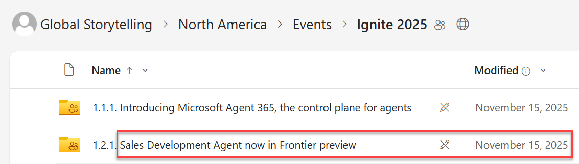Microsoft Global Storytelling media folders for Ignite 2025, starting with Agent 365 and then the Sales Development Agent.