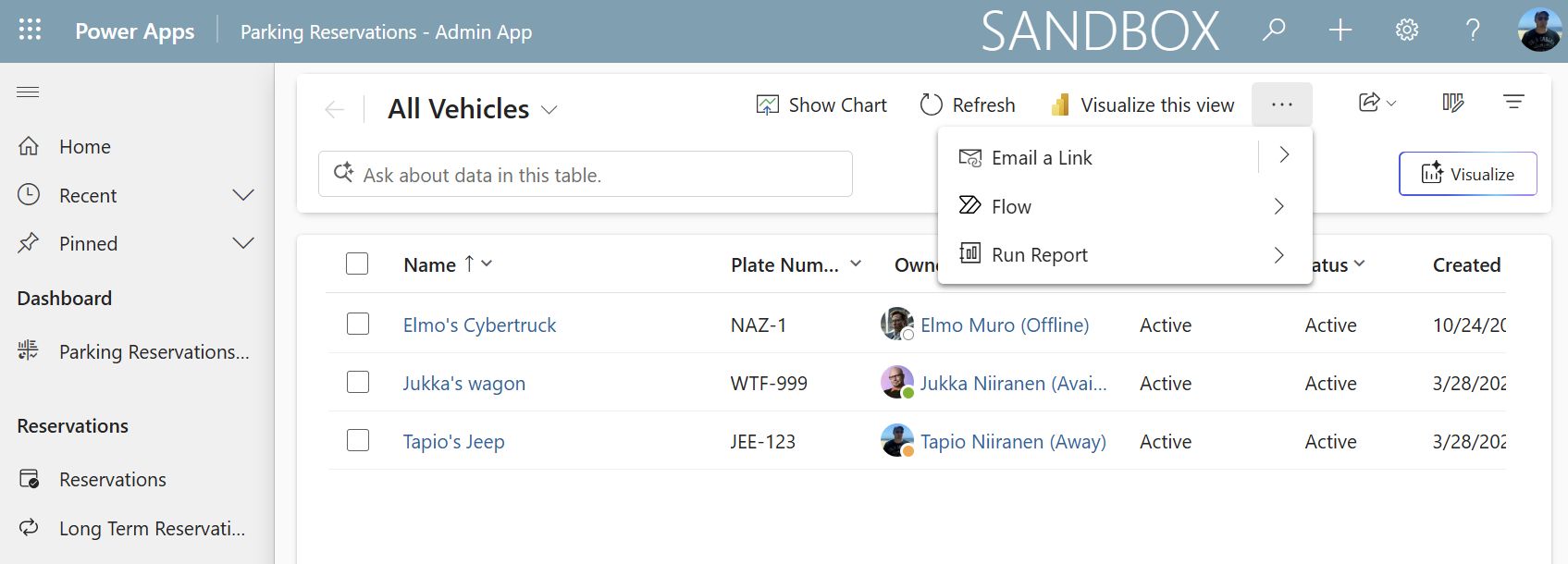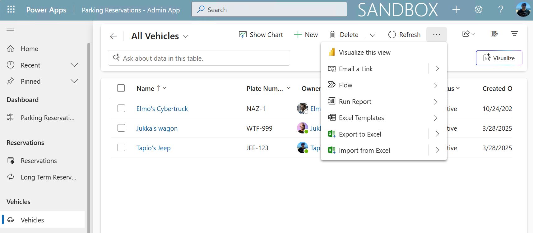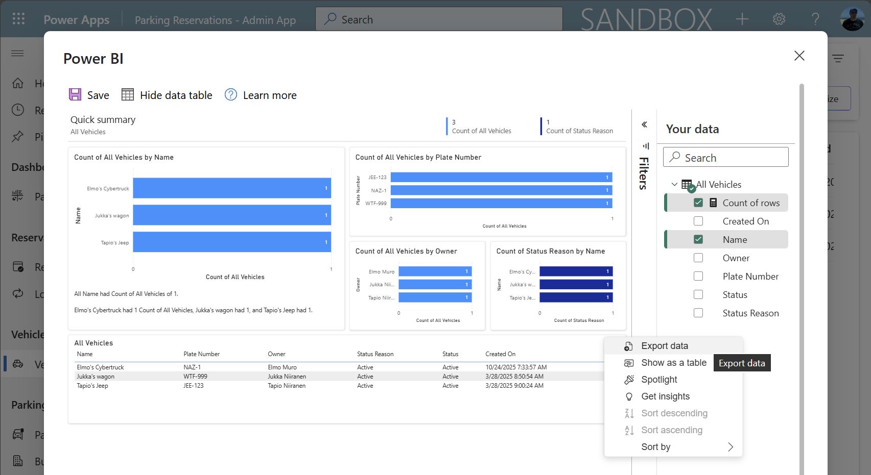 Model-driven Power App view of vehicle data, with command allowing the user to export it.