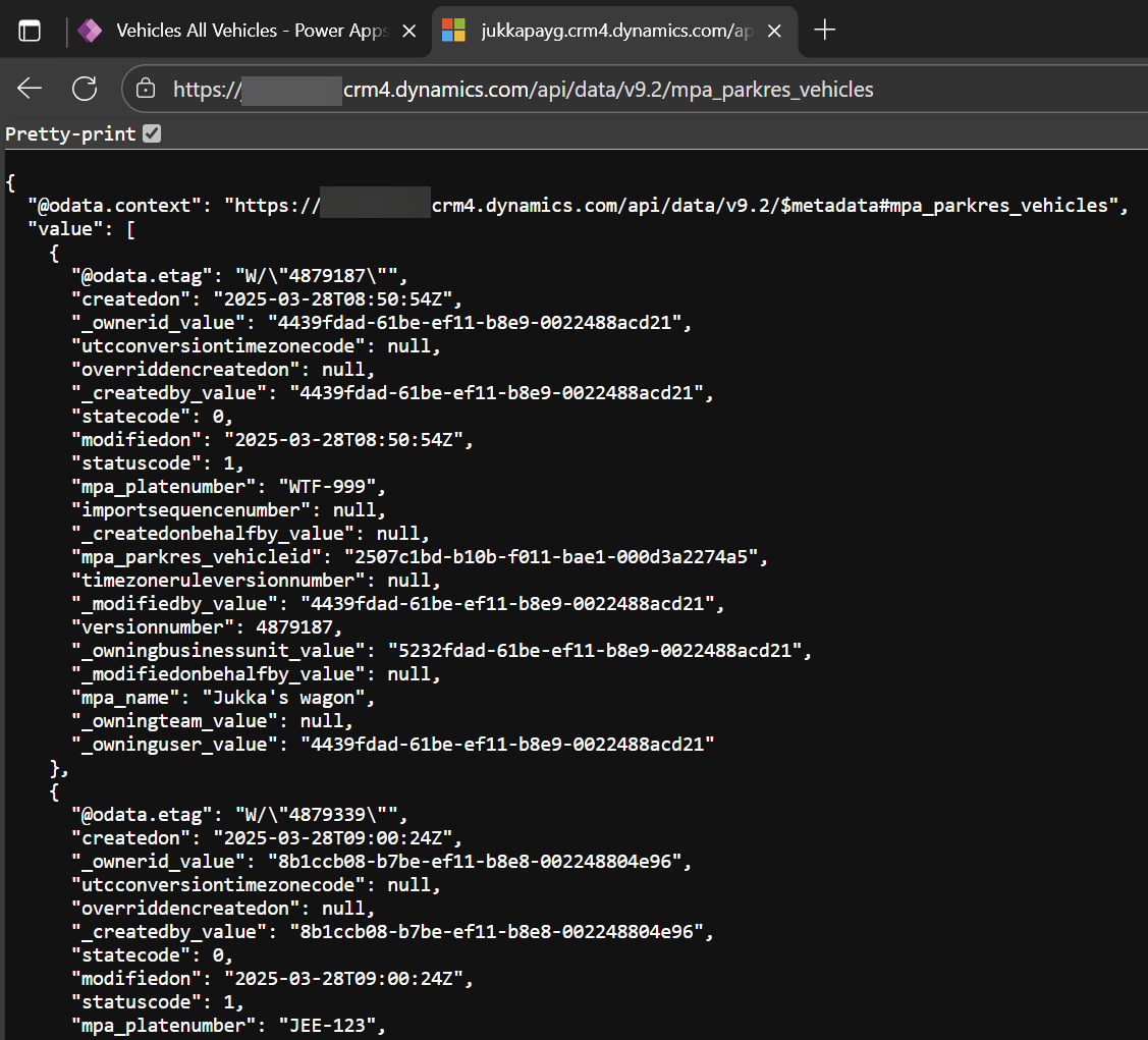 Opening the Web API URL for a Dataverse table, with all the data available in JSON format.