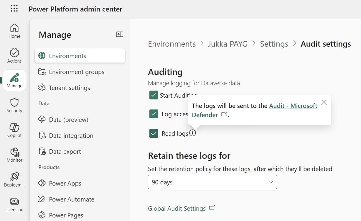 How could we catch those who break the rules? Examining the activities of users retrospectively is possible via the comprehensive audit logging capabilities Microsoft has built into its cloud. Microsoft Dataverse and model-driven apps activity logging documentation describes how you might find the needle in the haystack. Assuming you’ve remembered to turn on read auditing for your Power Platform environment, of course. Plus enabled the tables you care about for auditing, because defaults won’t necessarily cover them.
