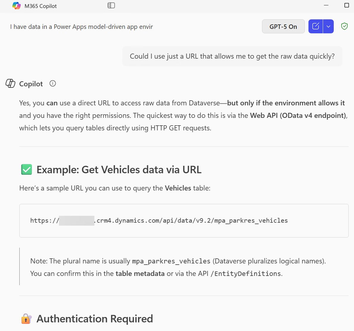Microsoft 365 Copilot Chat giving me the full URL to open for downloading Dataverse table data.