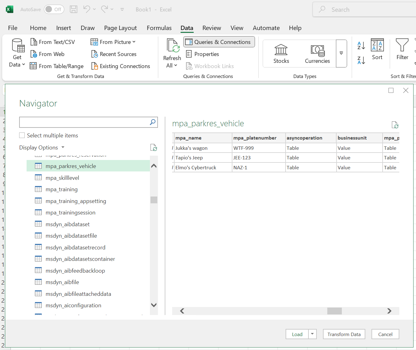One of the built-in options is getting data from Power Platform - Dataverse. Anyone dealing with business application security configuration absolutely should ask a regular user in their organization to open this menu. You might be surprised/shocked to see how many places are accessible to a user with their Entra ID identity. In our demo case, the user can of course read all columns from any table that they’ve been granted read access to via the Dataverse security roles: