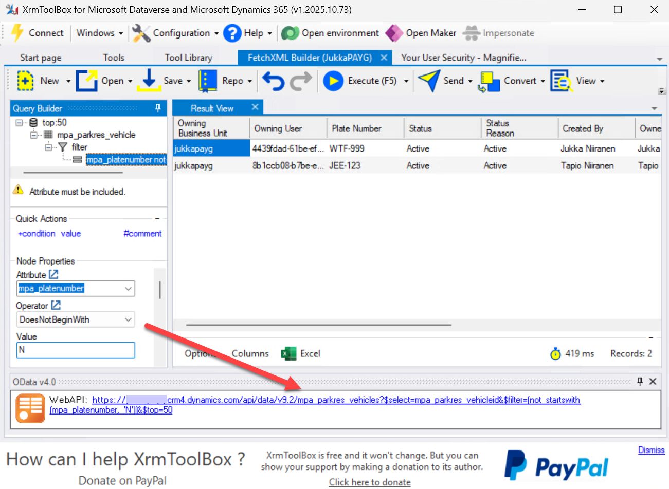 You don’t have to settle for just looking at the raw data of all the columns and rows in the table. Copilot could probably create the necessary filters for you via prompting it, but there’s also a GUI for that. FetchXML Builder in XrmToolBox allows you to visually configure the query, after which you get the OData v4.0 URL to retrieve the data in your browser: