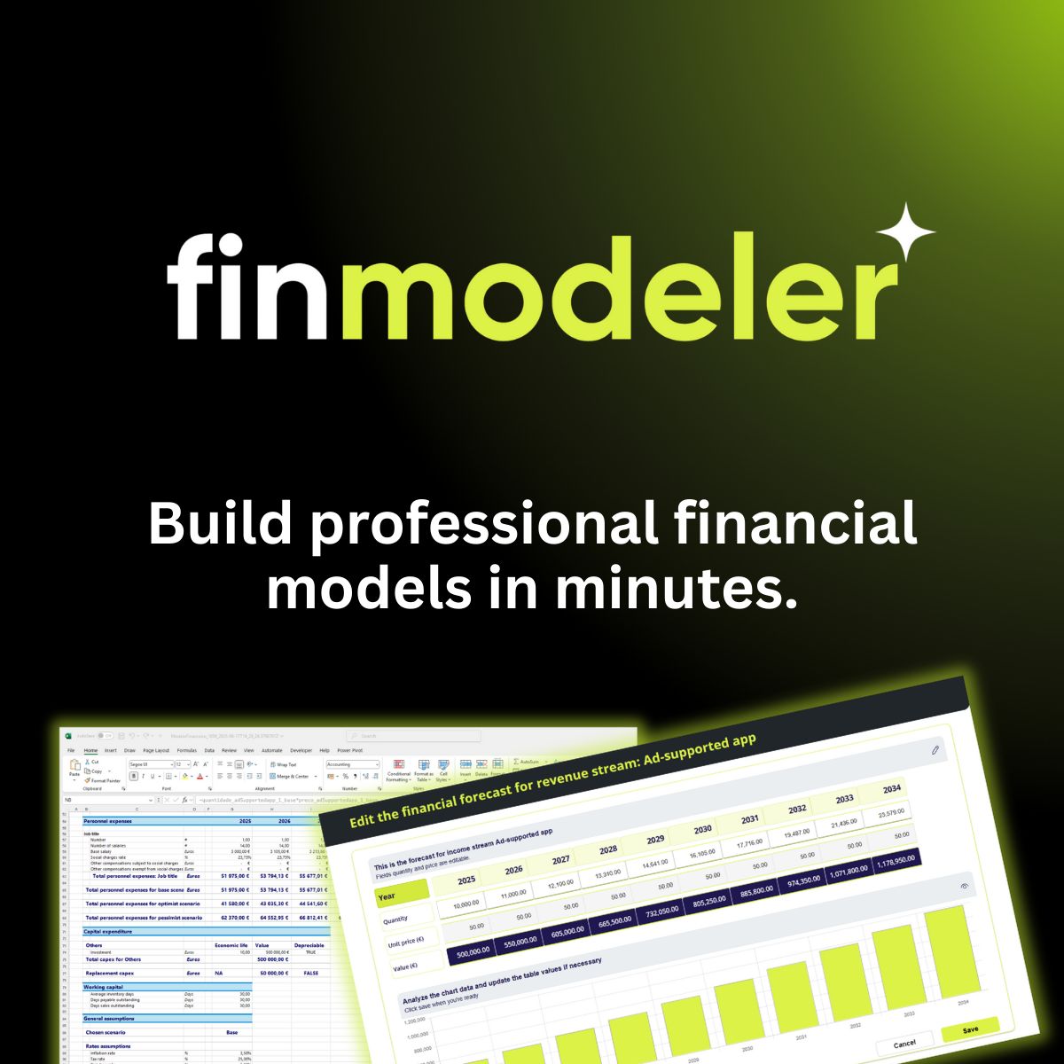 Try it now with a 14-day free trial. No credit card required. Export investor-ready P&L, cash flow, and KPI sheets in minutes. FinModeler — built on Microsoft Power Platform.