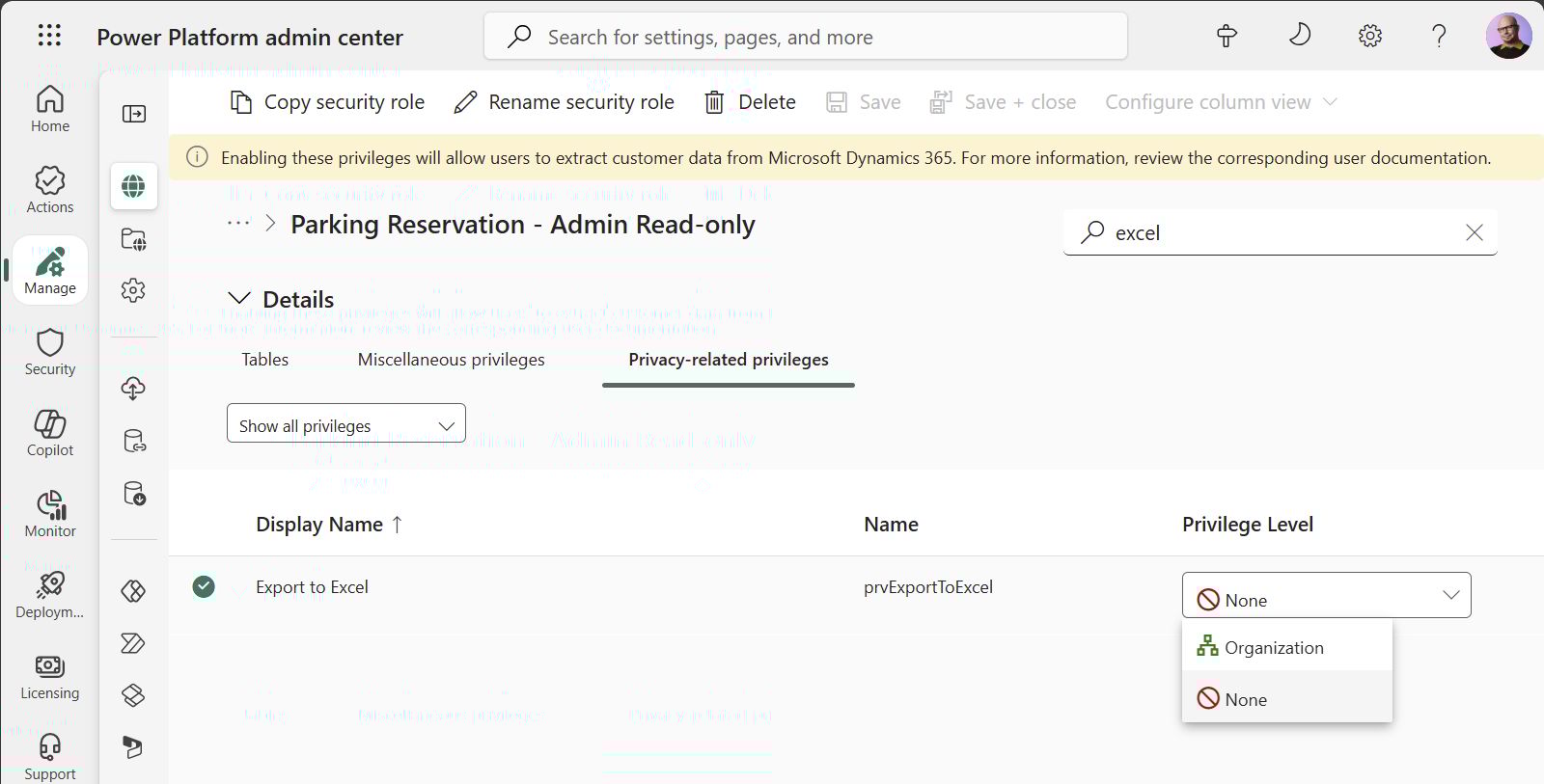 You can find this in the Dataverse security role editor, under privacy-related privileges. It’s an on/off switch that has no further granularity. You either can export to Excel or can’t.
